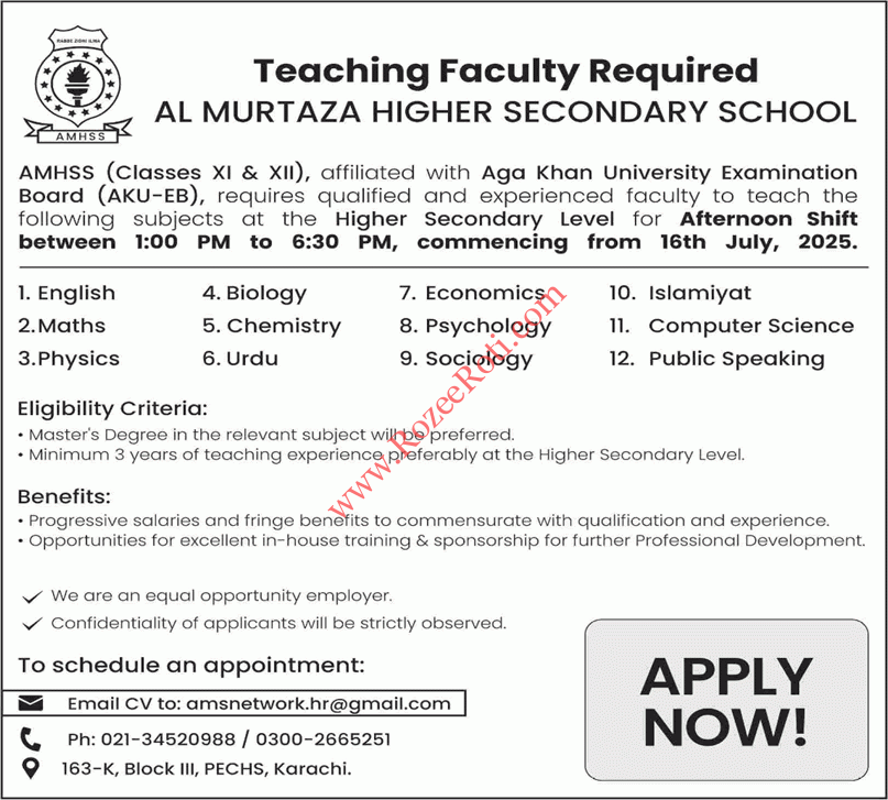 | Available Positions | *** Teaching Faculty *** English Math Physics Biology Chemistry Urdu Economics Psychology Sociology Islamiyat Computer Science Public Speaking |